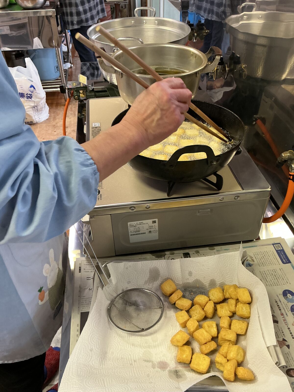 一方の台所では、おもてなしの「お寺ご飯」作りが行われていました。一汁一菜の「けんちん」作りです。今回は精進料理なので、揚げ豆腐を入れます。