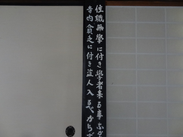 解放されていた医光寺のお座敷を見ていると、玄関近くのお部屋に張り紙ならぬ張り板がありました。和尚さんがお書きになったものと思われます。